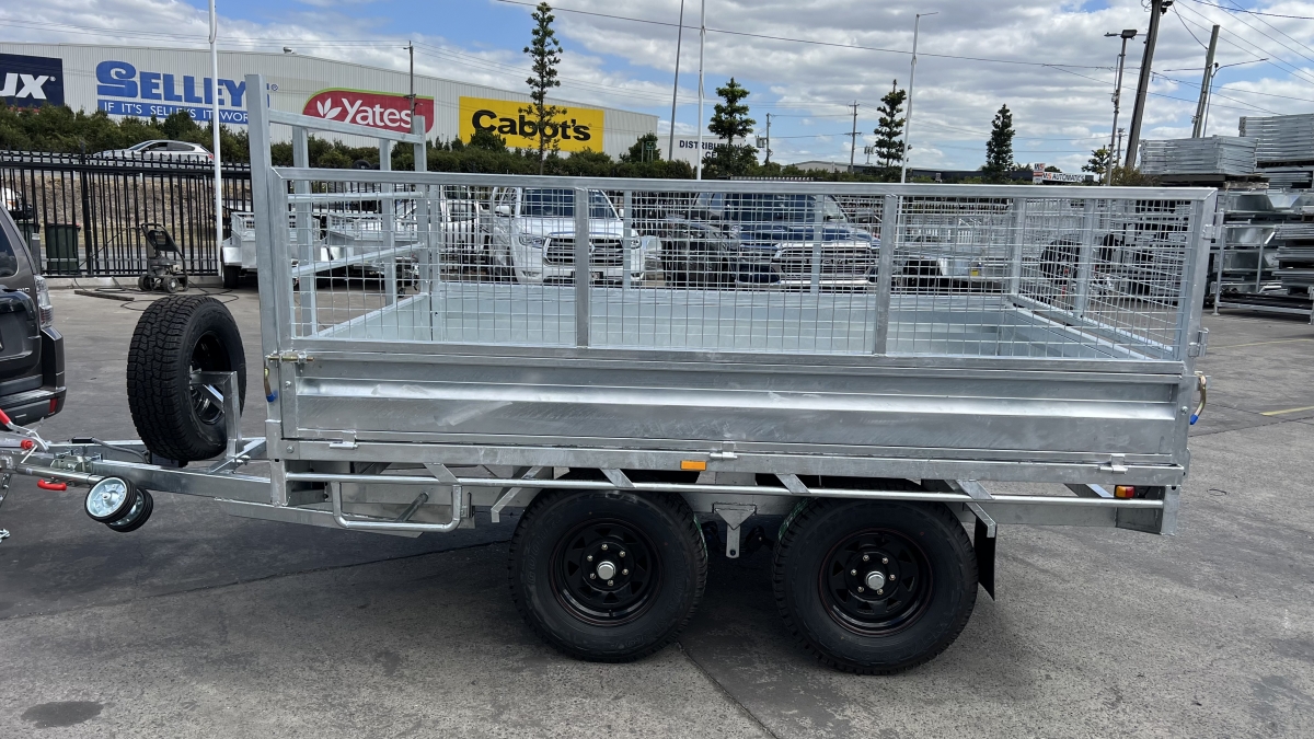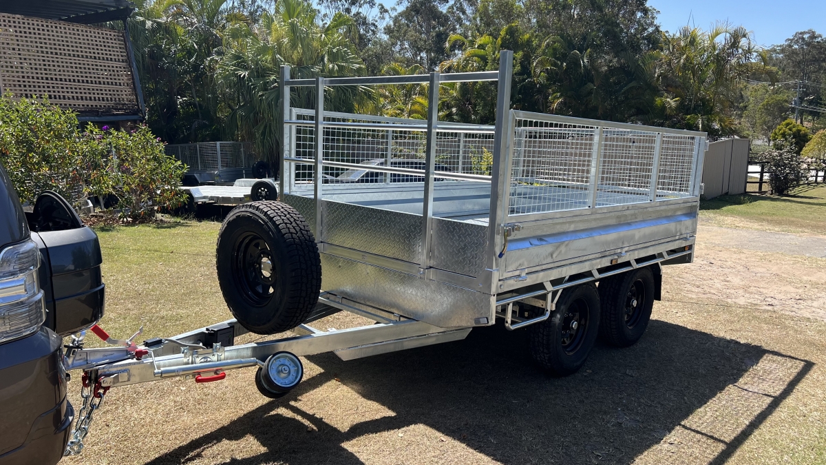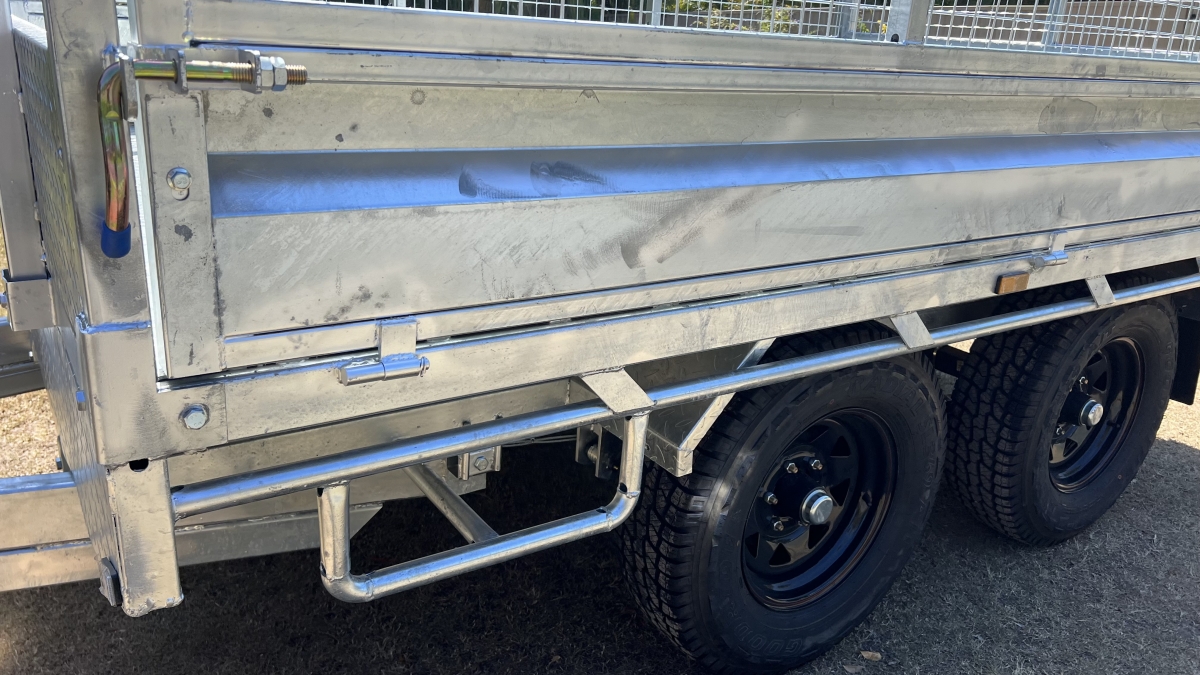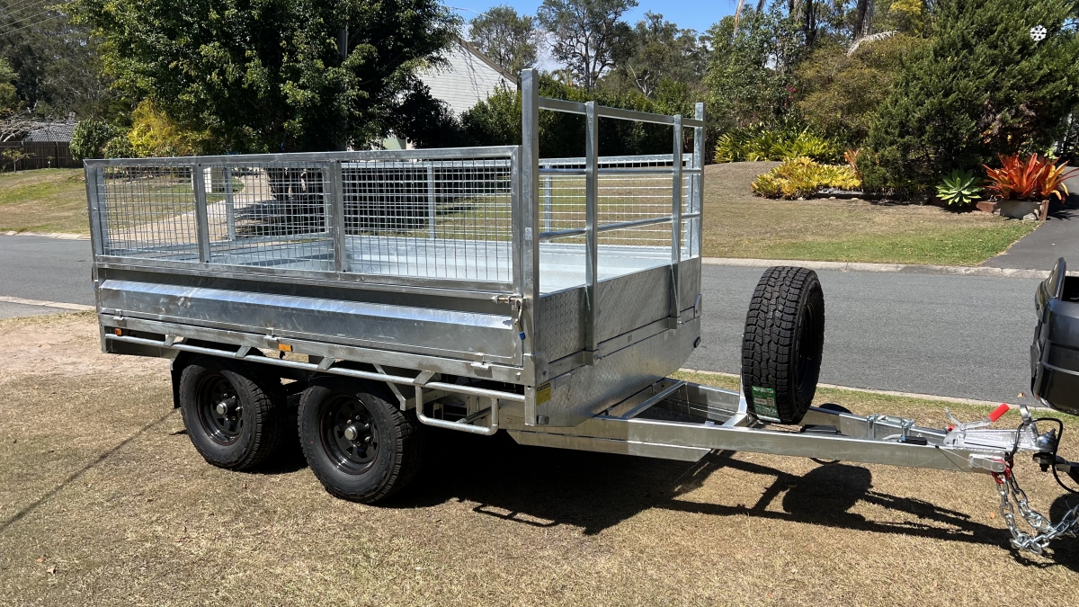 3.5t Gvm DECK SIZE 10'x 6' x300 mm Removable sides 600 Cage - 2 x 1800 Slide way Ramps-Galvanised -upright Spare Wheel - 100mm Structural chassis super strong and flexible-Under body extra bracing for trade use long lasting construction- 890kg tare - Fully Welded Heavy Duty Body and Chassis-Heavy Duty Japanese Sealed Dexter Bearings tested to 100 k klms - 2 x 63 mm solid axles Each Axle rated at 3.0t -Comes with 12inch Electric Brakes-Quality Breakaway Unit fitted- LED lights with Marker Lights on the sides. Tie Rails- 2000 mm Long Draw Bar -3.5t Coupling with handbrake - Rocker Roller Suspension with Heavy Duty 9 Leaf Springs - 225-70 R15lt black Sunraysia rims -10inch Heavy Duty Jockey Wheel