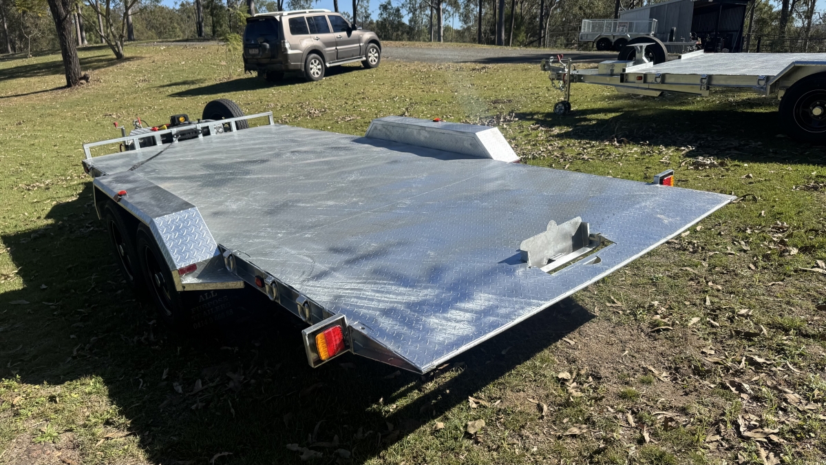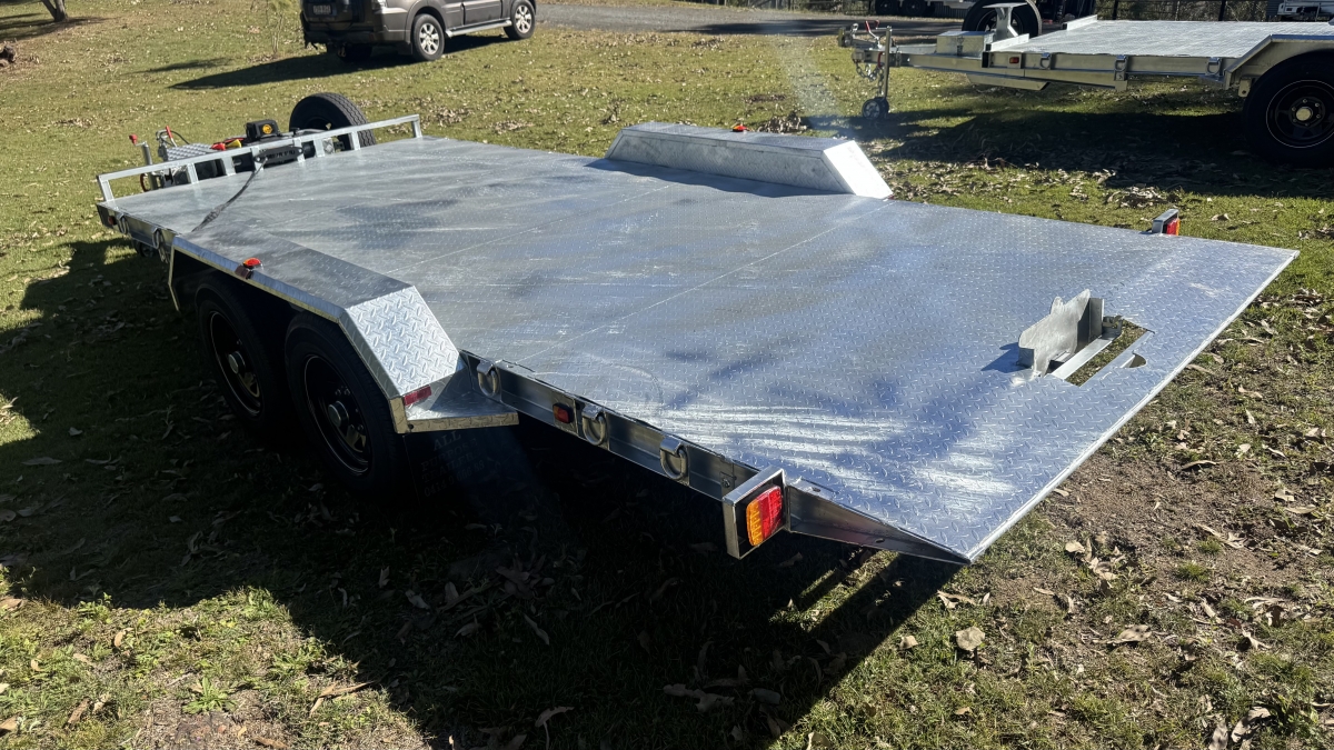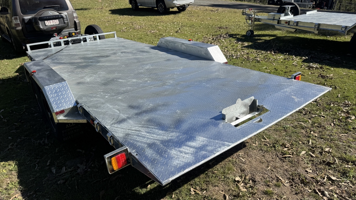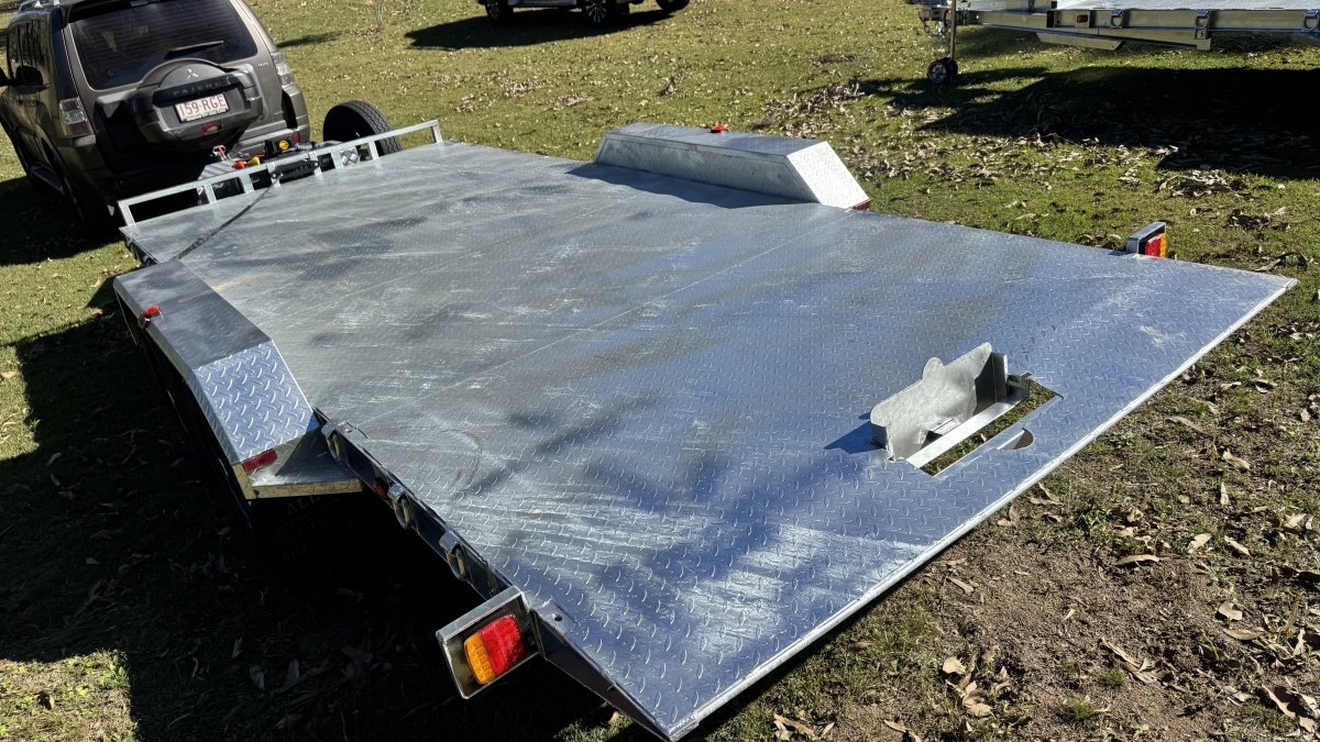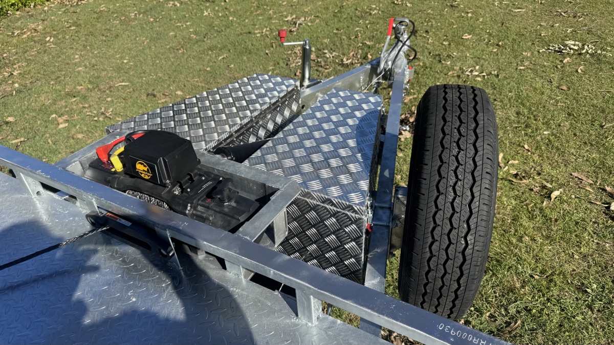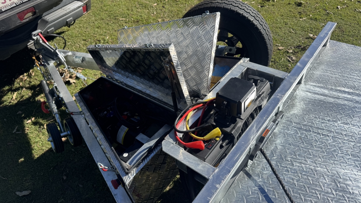 13500 lb electric winch with hard wire and remote -upright bracket and spare wheel -Tilt action loading- 12 x Tie down Points -63 mm Square Axle rated at 3.0t each Dexter size Japanese Sealed Bearings No need for re-greasing Tested to 100k klms