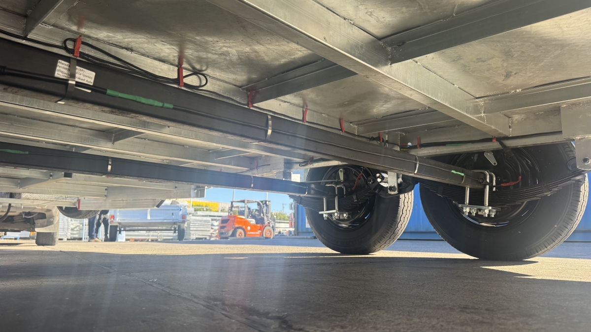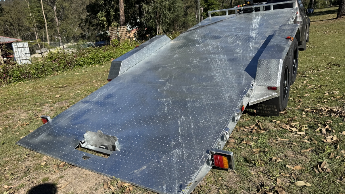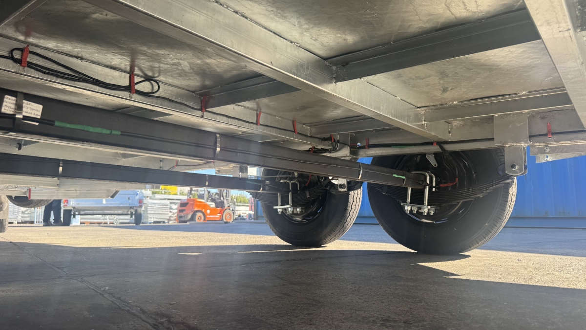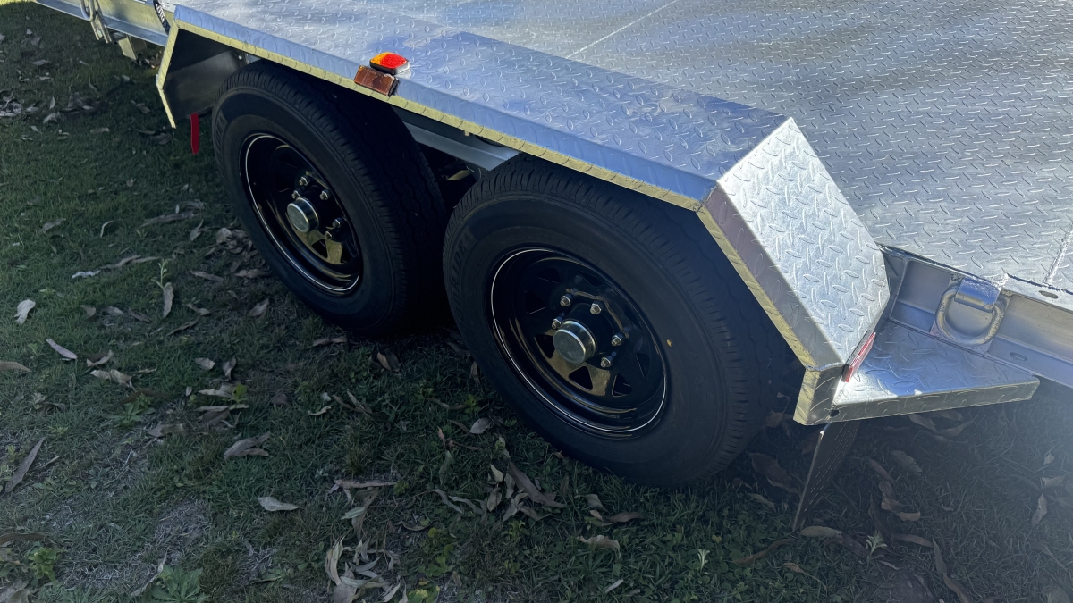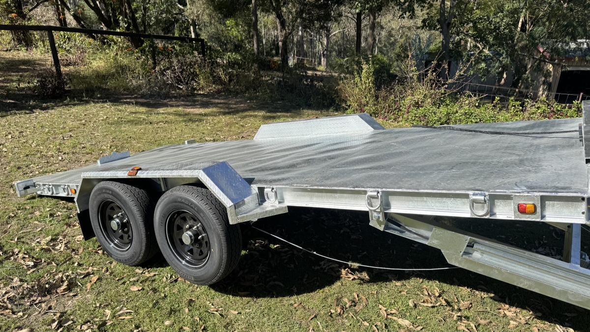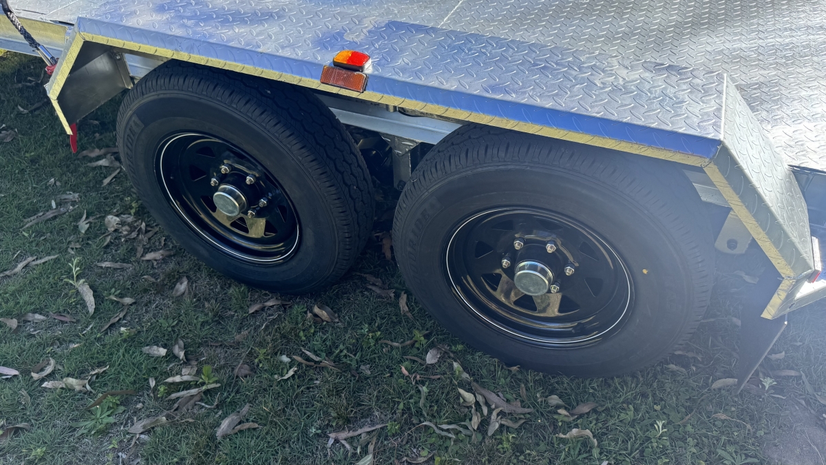 13500 lb electric winch with hard wire and remote -upright bracket and spare wheel -Tilt action loading- 12 x Tie down Points -63 mm Square Axle rated at 3.0t each Dexter size Japanese Sealed Bearings No need for re-greasing Tested to 100k klms