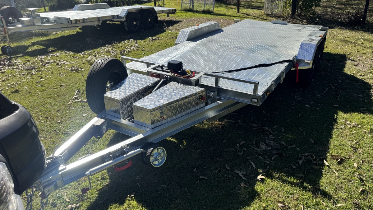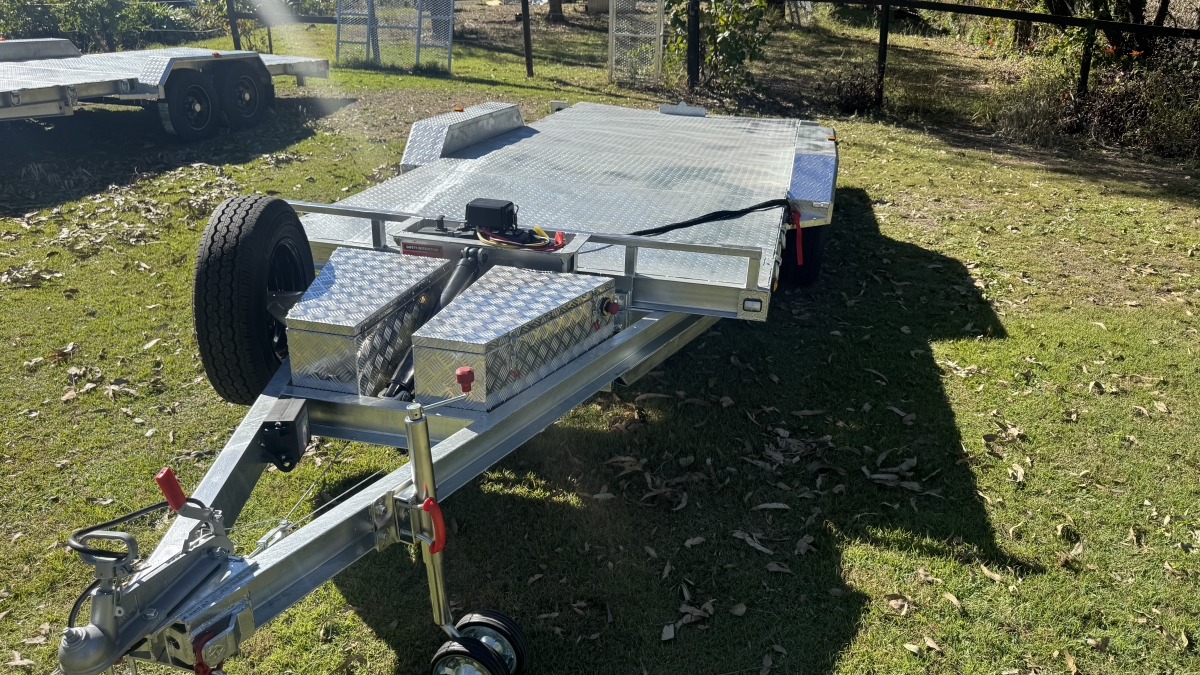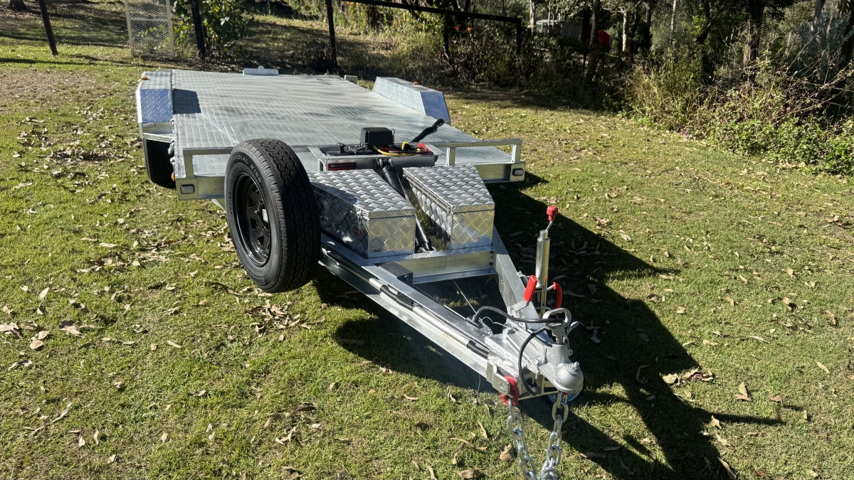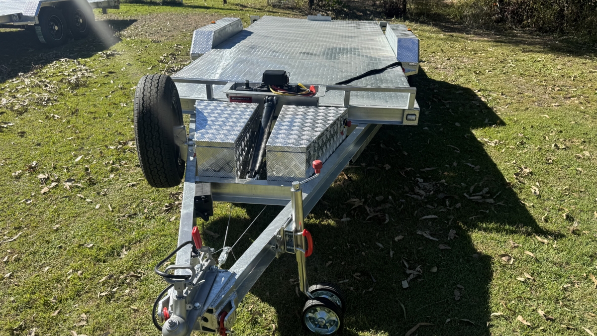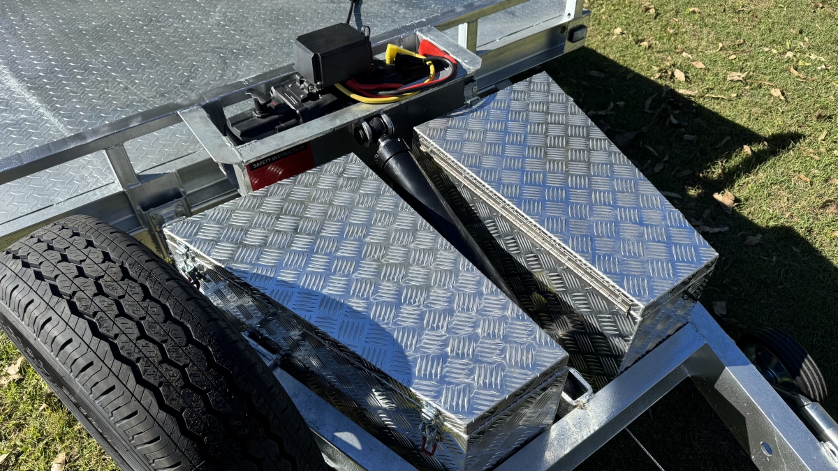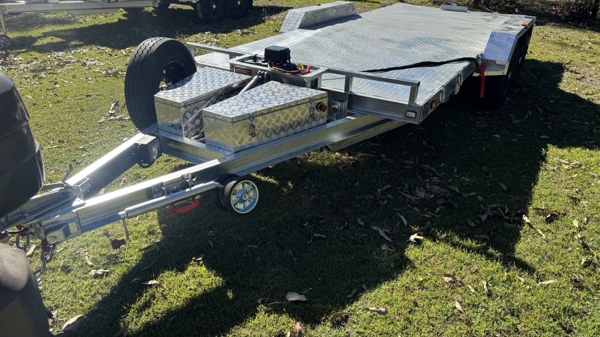 4 x 12" electric Brakes Quality Breakaway box Unit fitted -LED lights with Marker Lights on the sides-50mm 3.5t Quick Release Coupling -extended Draw Bar With 125mm x 55mm x 8mm C Section - 2x alloy toolboxs with Hydraulic pump hard wired and remote Gel battery Rocker Roller Suspension with Heavy Duty 4.5t 9 Leaf Springs -LAND-CRUISER 6 stud new 195 R15c tyres Black Sunraiser rims - Twin wheel Hd jockey Wheel-