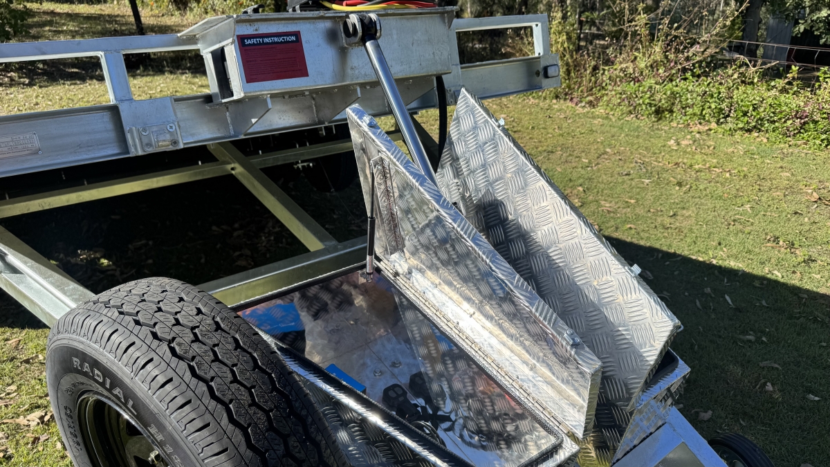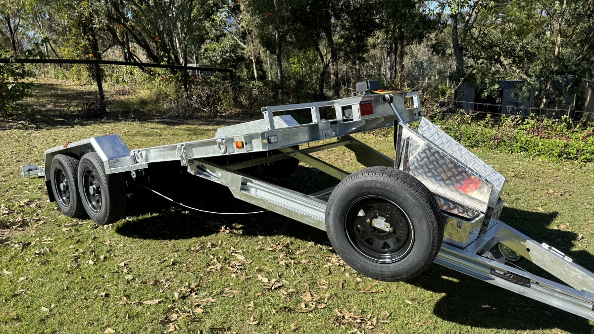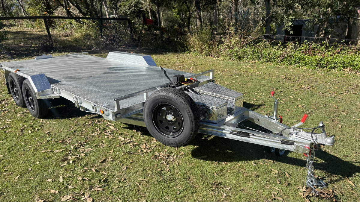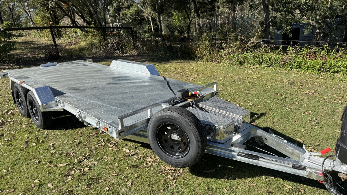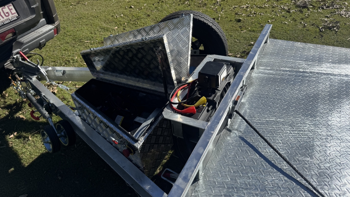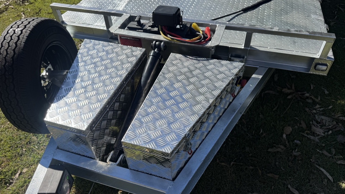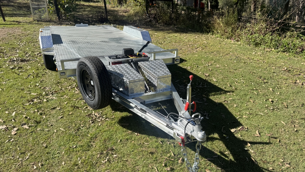 4 x 12" electric Brakes Quality Breakaway box Unit fitted -LED lights with Marker Lights on the sides-50mm 3.5t Quick Release Coupling -extended Draw Bar With 125mm x 55mm x 8mm C Section - 2x alloy toolboxs with Hydraulic pump hard wired and remote Gel battery Rocker Roller Suspension with Heavy Duty 4.5t 9 Leaf Springs -LAND-CRUISER 6 stud new 195 R15c tyres Black Sunraiser rims - Twin wheel Hd jockey Wheel-