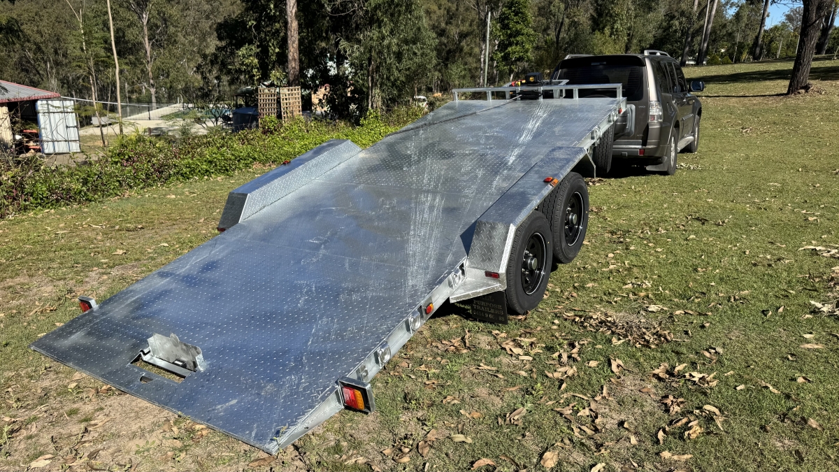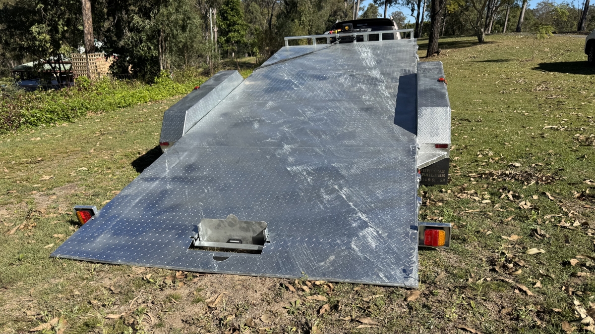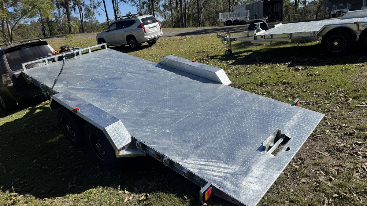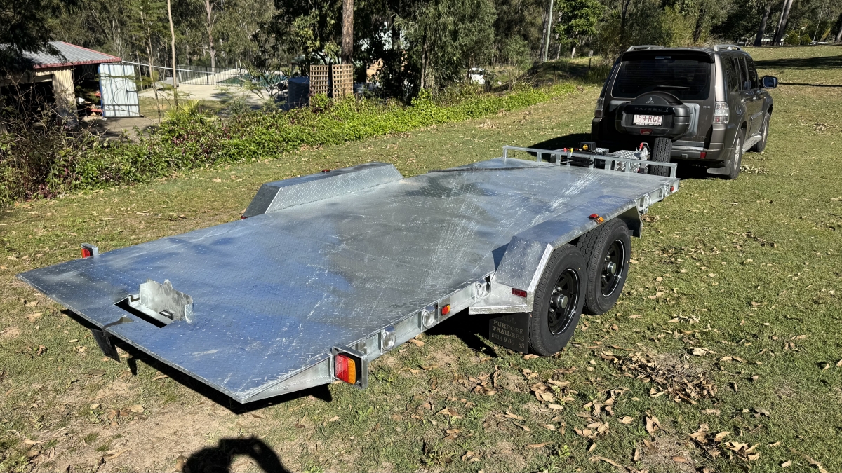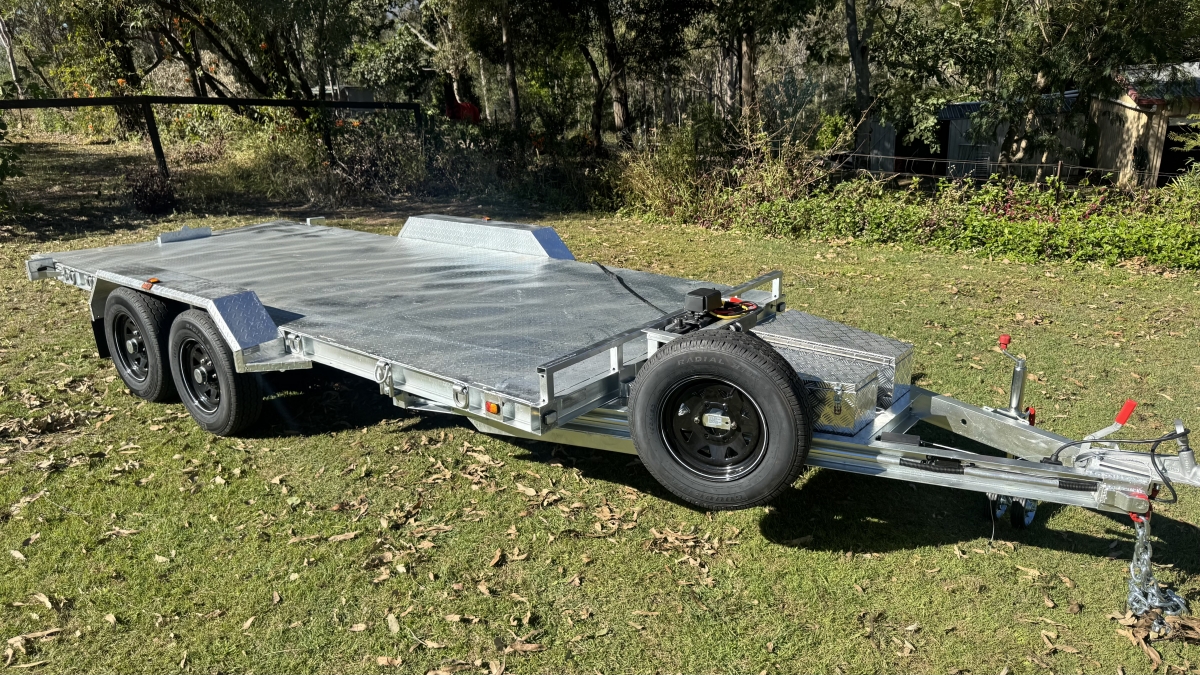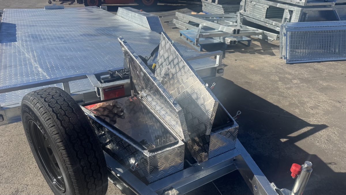 4 x 12" electric Brakes Quality Breakaway box Unit fitted -LED lights with Marker Lights on the sides-50mm 3.5t Quick Release Coupling -extended Draw Bar With 125mm x 55mm x 8mm C Section - 2x alloy toolboxs with Hydraulic pump hard wired and remote Gel battery Rocker Roller Suspension with Heavy Duty 4.5t 9 Leaf Springs -LAND-CRUISER 6 stud new 195 R15c tyres Black Sunraiser rims - Twin wheel Hd jockey Wheel-