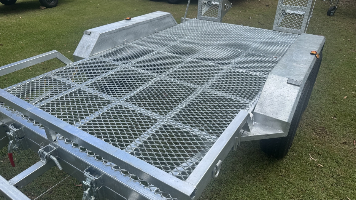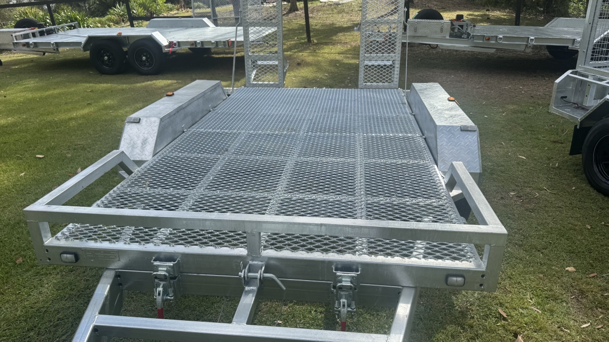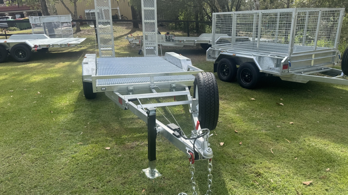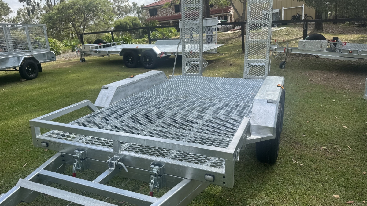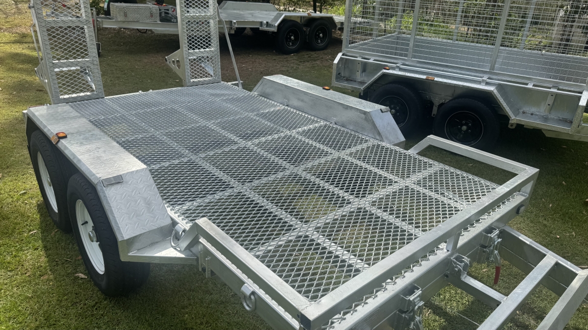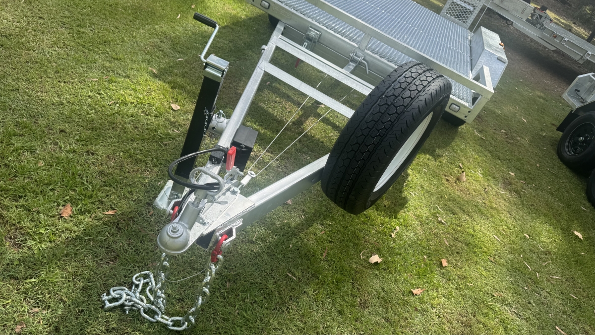 3100x1800 mm Mesh Deck Tare 890 kg ,Twin split ramps adjustable in and out with stand supports .Black Sunraysia Rims 225r15 lt tyres ,12 inch Electric Brakes with Hand Brake, Brake away box , 2x 63mm Solid Square axles 3.0t each Japanese Sealed Dexter Bearings tested to 100k klms ,9 leaf roller rocker 4.5t Springs, Acid etched then Submerged hot Galvanised ,2000 mm x100 mm x4 mm Extended Drawbar ,Heavy Duty jockey Stand ,2xHammerlock Safety Chains ,Available in in 4.5t gvm for $250 more