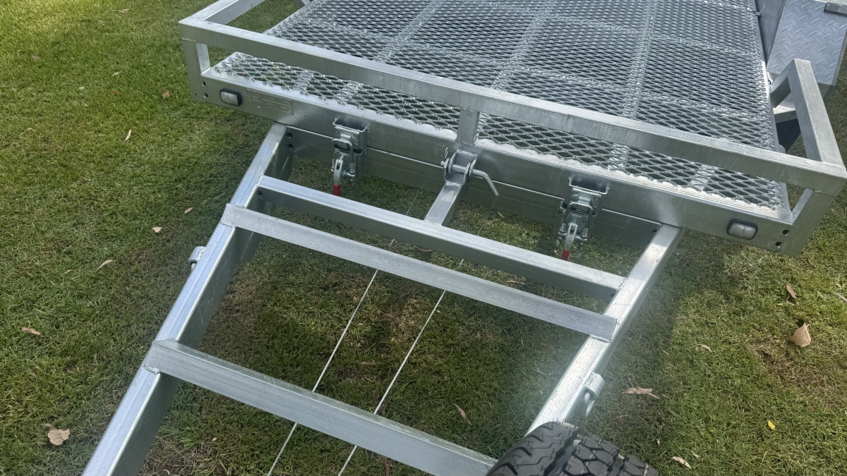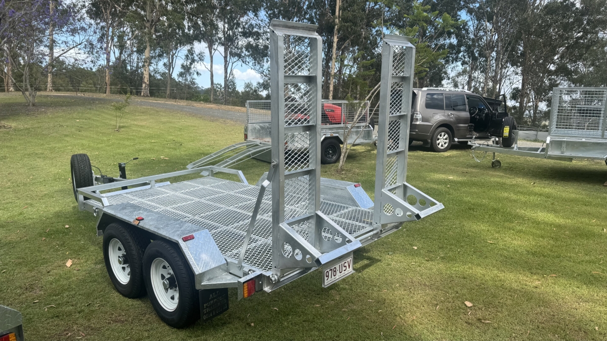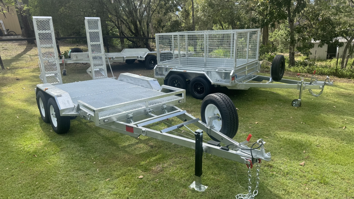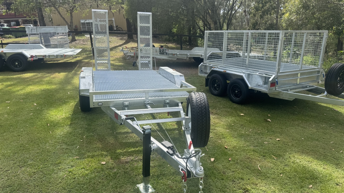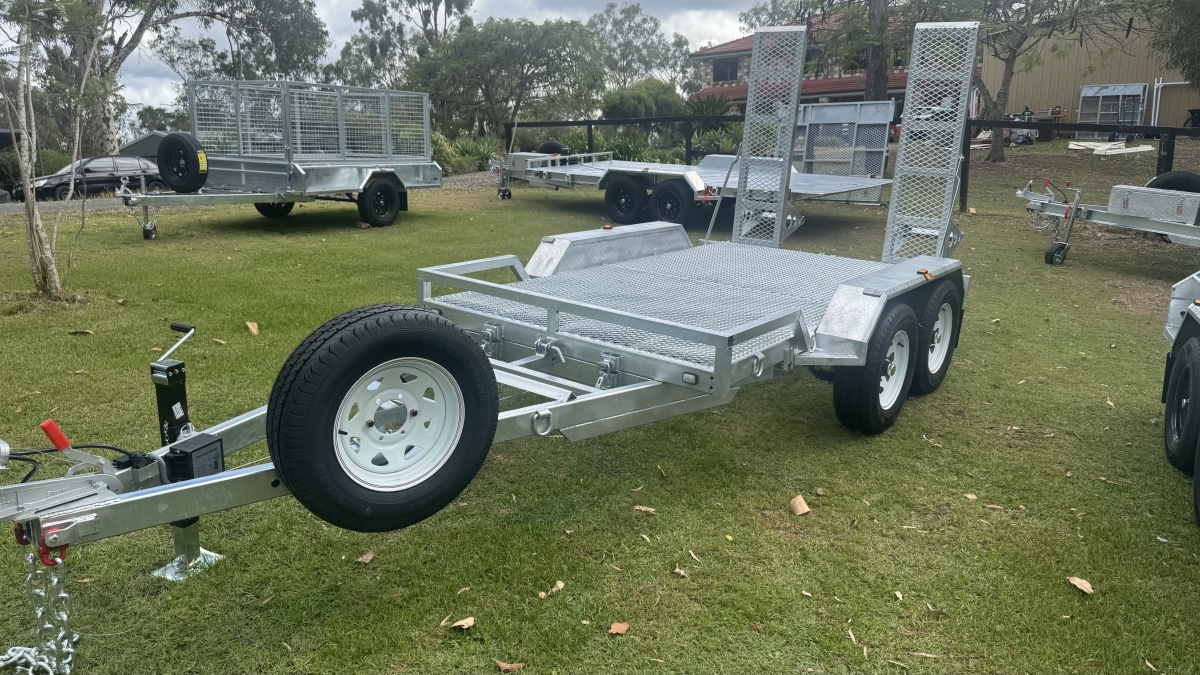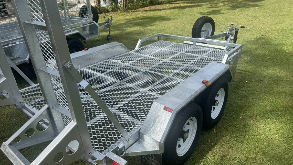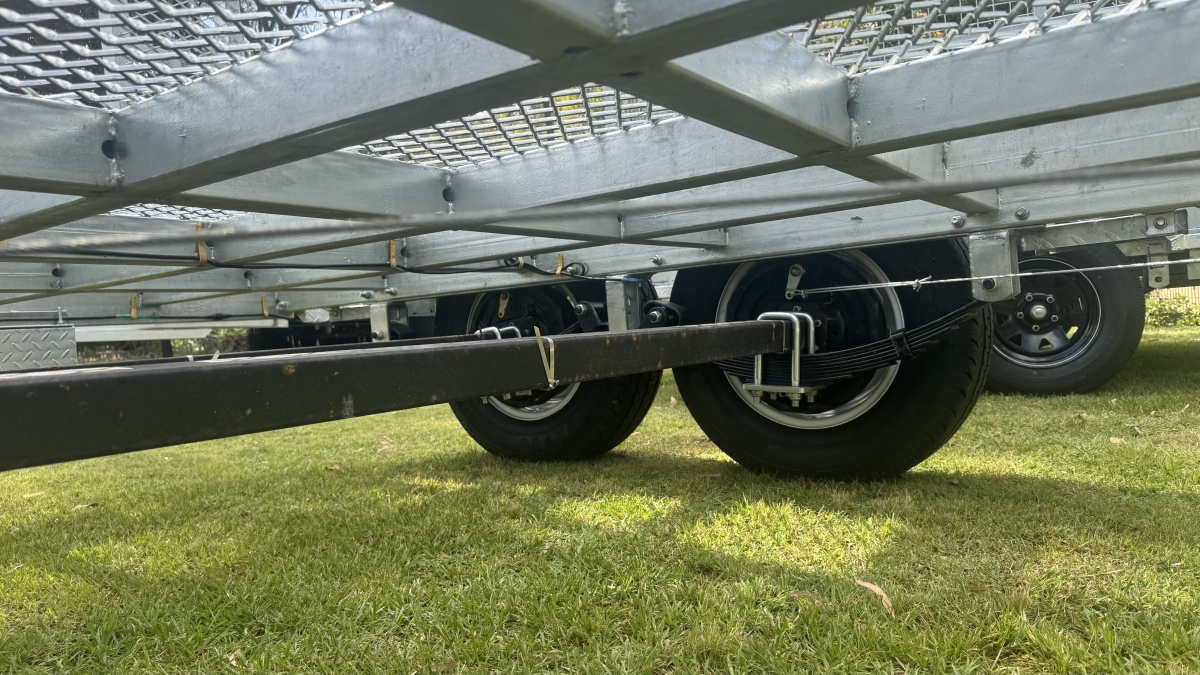 3100x1800 mm Mesh Deck Tare 890 kg ,Twin split ramps adjustable in and out with stand supports .Black Sunraysia Rims 225r15 lt tyres ,12 inch Electric Brakes with Hand Brake, Brake away box , 2x 63mm Solid Square axles 3.0t each Japanese Sealed Dexter Bearings tested to 100k klms ,9 leaf roller rocker 4.5t Springs, Acid etched then Submerged hot Galvanised ,2000 mm x100 mm x4 mm Extended Drawbar ,Heavy Duty jockey Stand ,2xHammerlock Safety Chains ,Available in in 4.5t gvm for $250 more