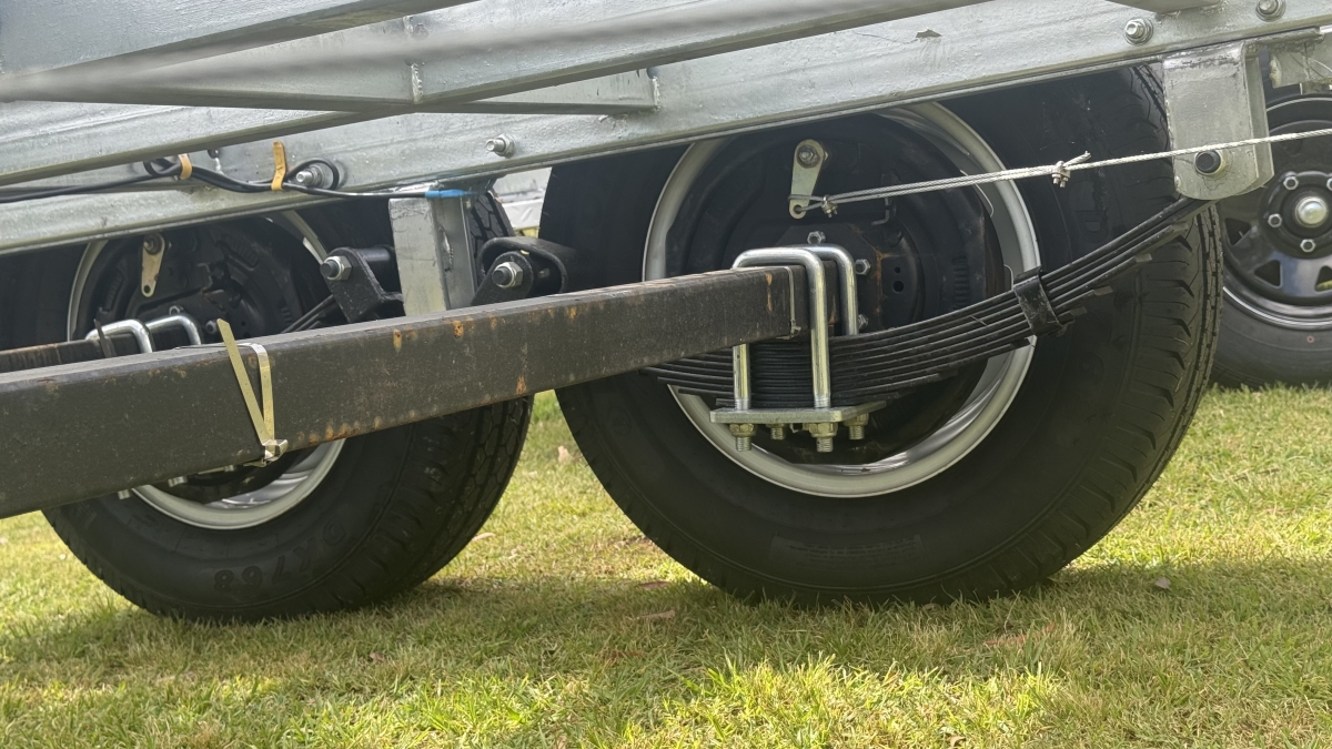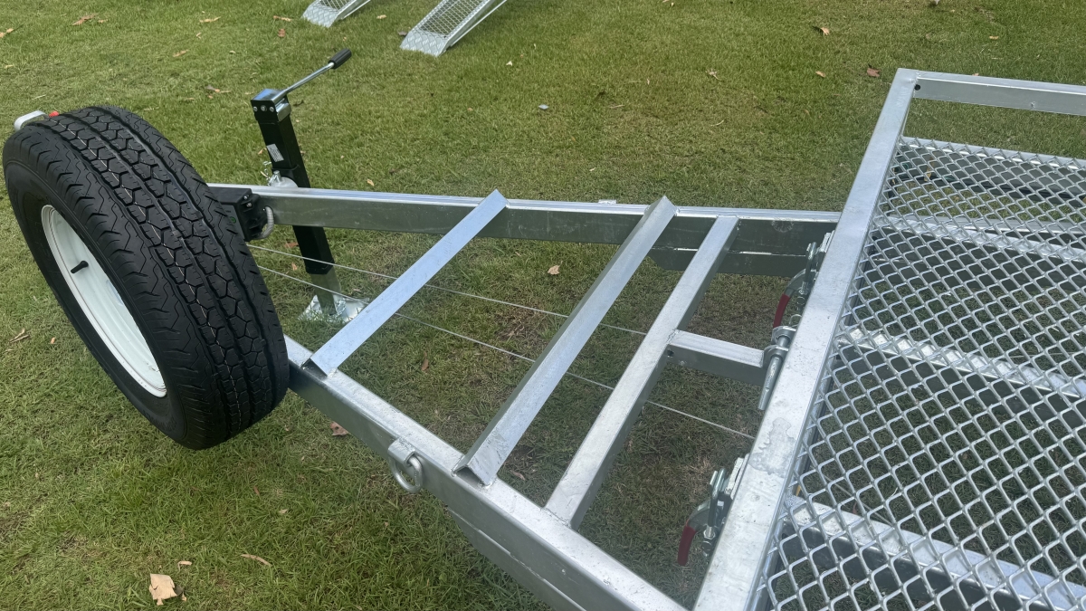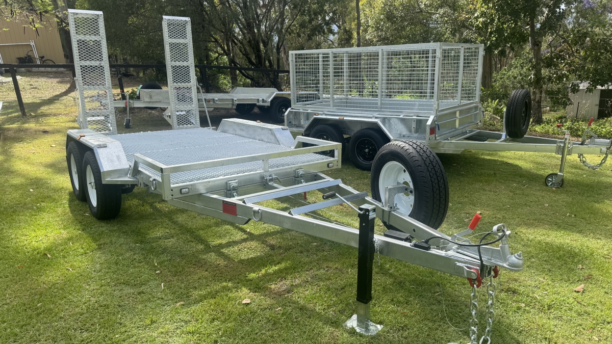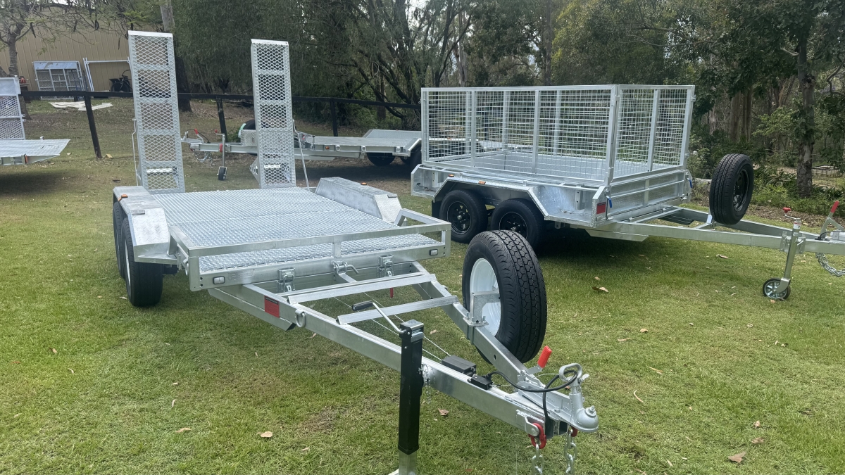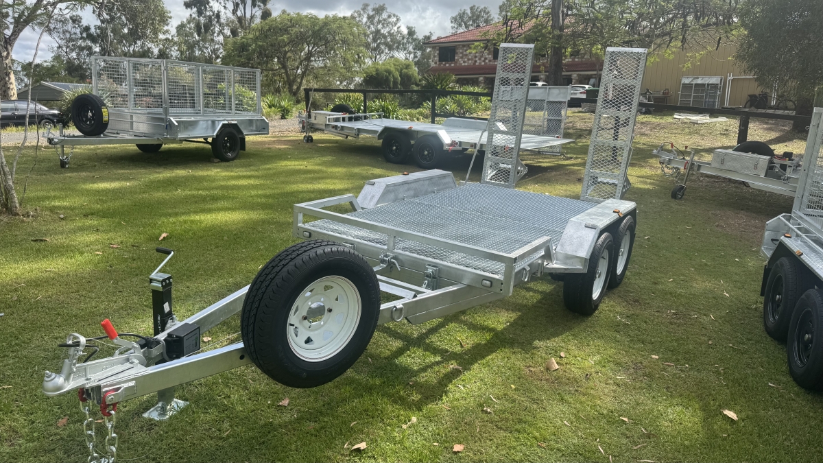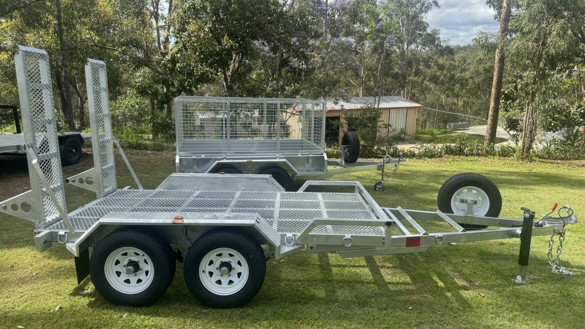 3100x1800 mm Mesh Deck Tare 890 kg ,Twin split ramps adjustable in and out with stand supports .Black Sunraysia Rims 225r15 lt tyres ,12 inch Electric Brakes with Hand Brake, Brake away box , 2x 63mm Solid Square axles 3.0t each Japanese Sealed Dexter Bearings tested to 100k klms ,9 leaf roller rocker 4.5t Springs, Acid etched then Submerged hot Galvanised ,2000 mm x100 mm x4 mm Extended Drawbar ,Heavy Duty jockey Stand ,2xHammerlock Safety Chains ,Available in in 4.5t gvm for $250 more