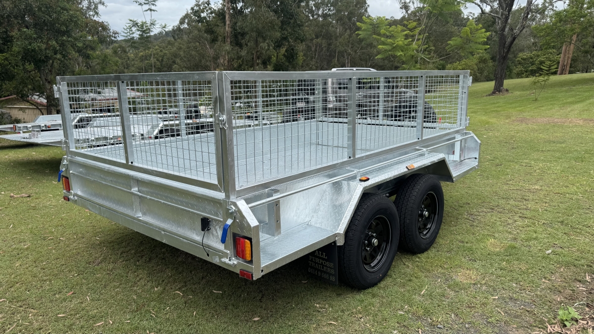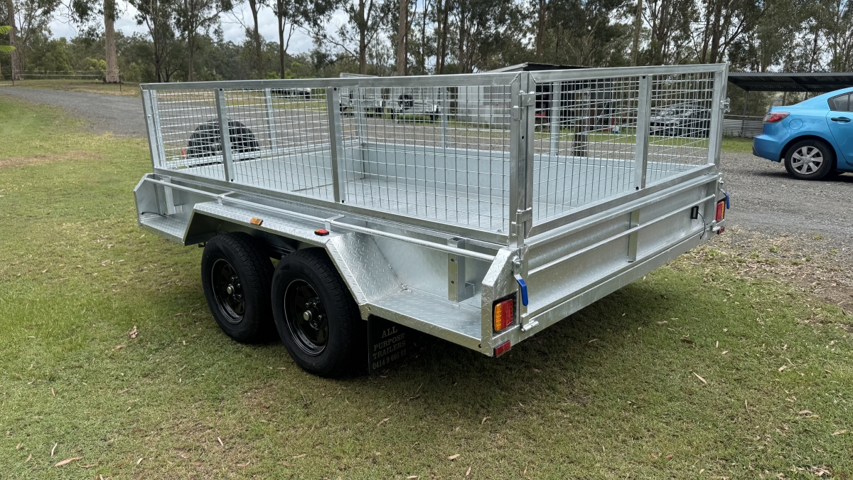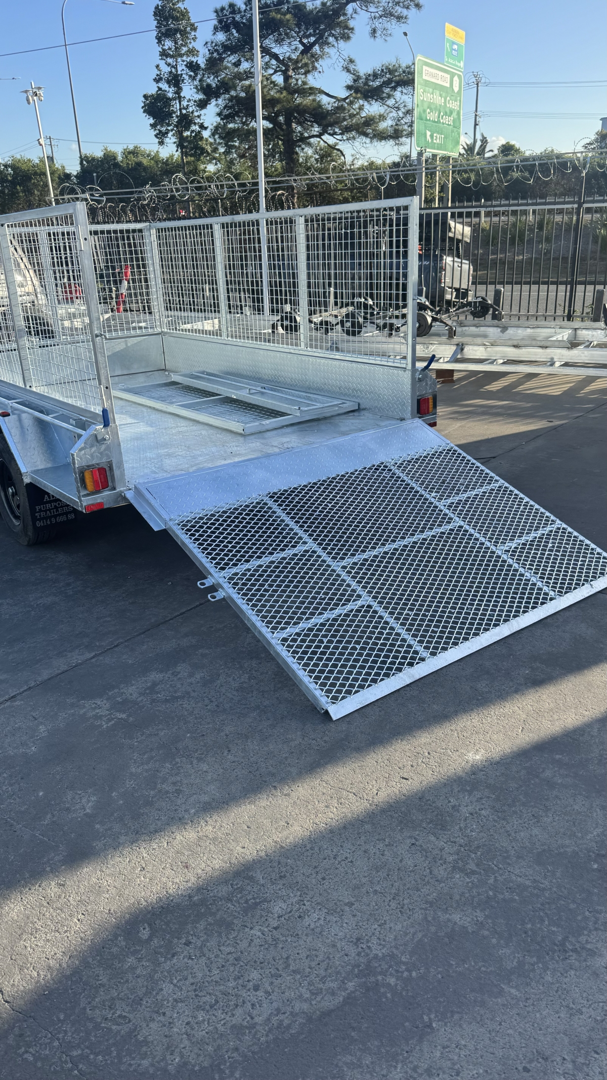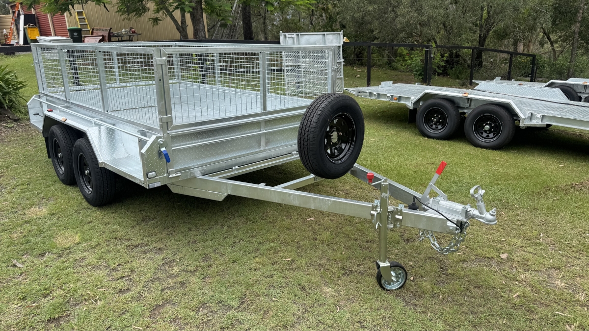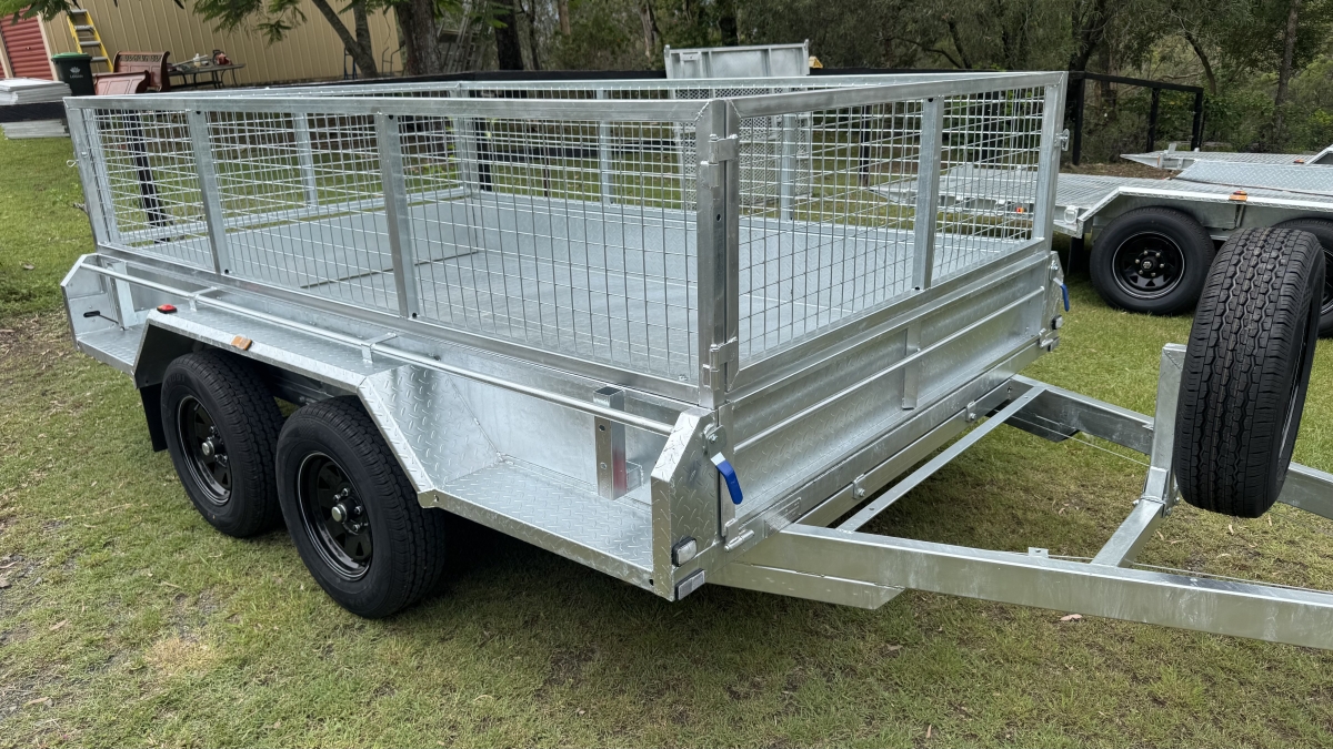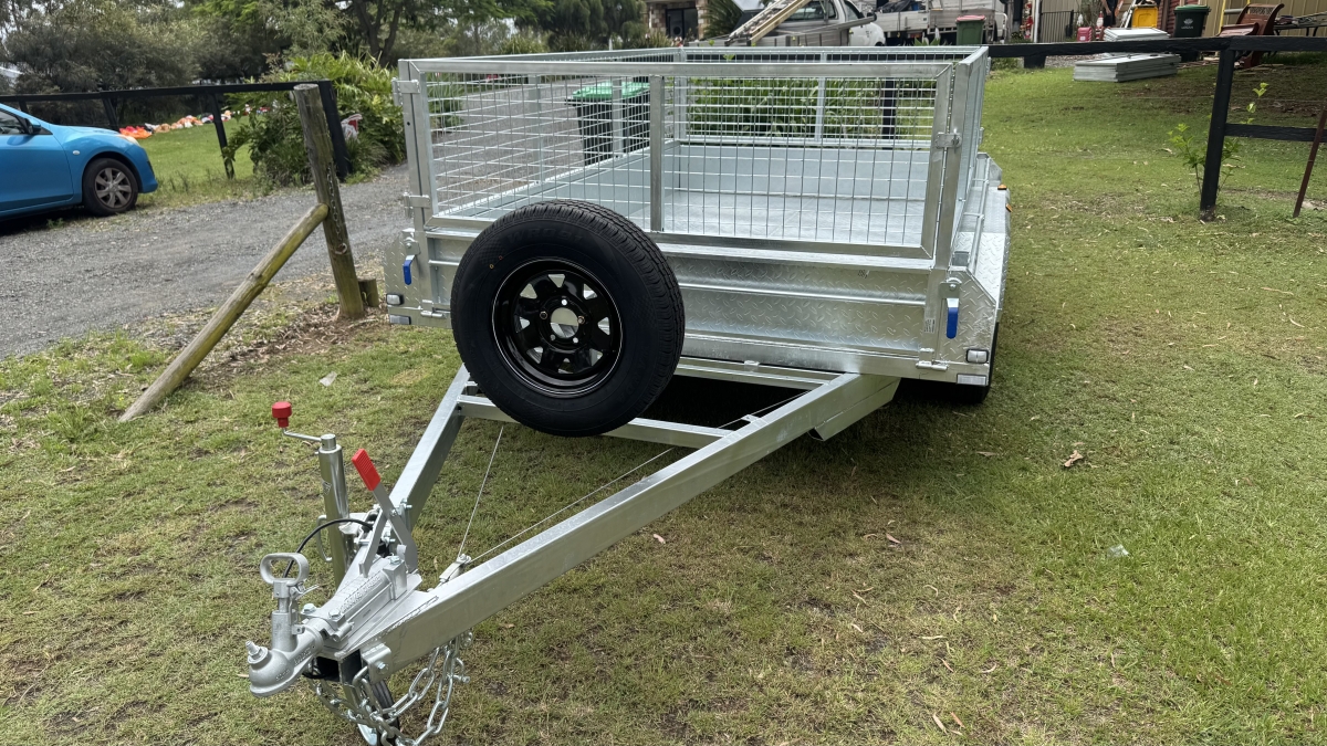 New tradies special Heavy duty premium top of the range built tuff box trailer 2000 gvm - 10' x 6' x 300 mm sides 600 cage - duel axle -hot dipped galvanised -100mm x 50mm Rhs box 2000 mm extended draw bar -2 x 10mm safety chain - chassis 50mm x 50mm box RHS with extra 40mm x 40mm front to back center supports - 2.5 mm floor and sides all checker plate - 45 mm Square solid axles 5 stud ford pattern -heavy duty rocker roller suspension- front tailgate - heavy duty hand rails all round-manual override disc brakes- full length check plate side steps- 8" swing away jockey wheel -spare wheel - recessed sealed LED lights - 5 x new sunraiser wheels and 185r14 commercial tyres